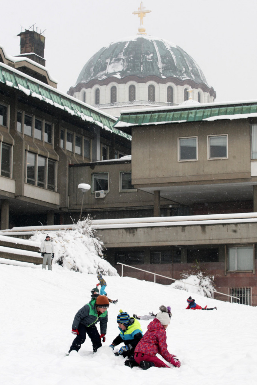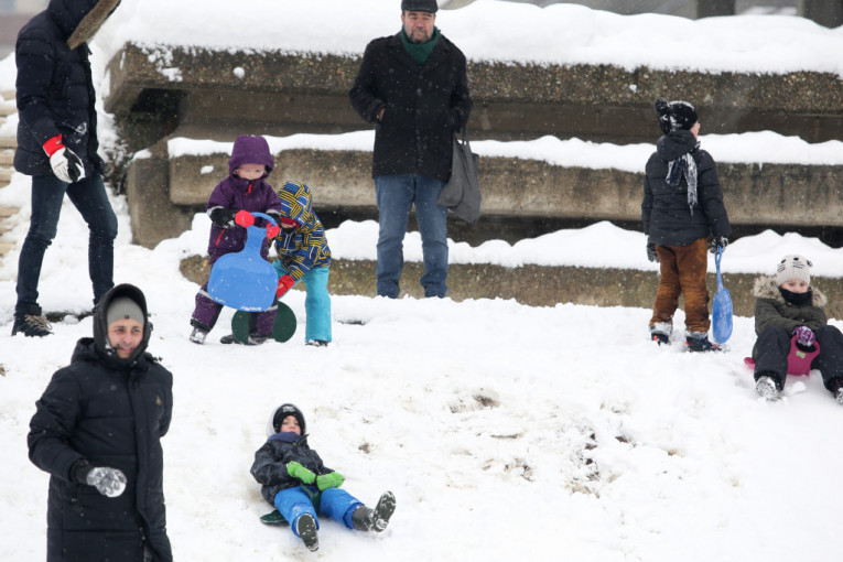 Na platou ispred hrama Svetog Save, danas se okupio veliki broj mališana koji su opremljeni adekvatnom opremom pohrlili da naprave prvi spust na prvom snegu ove zime.