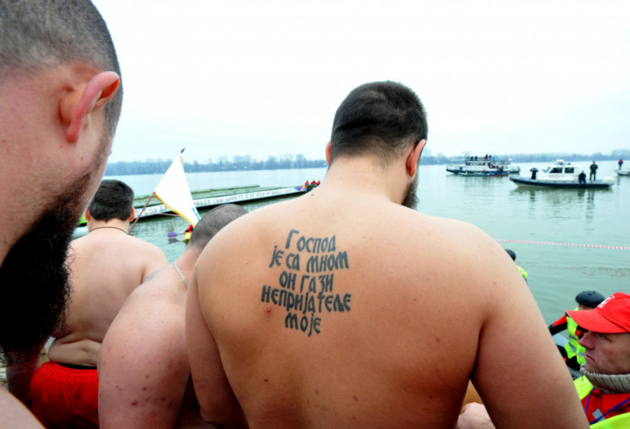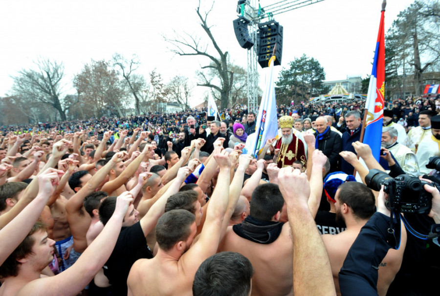 Patrijarh Irinej je nakon službe pokropio učesnike osvećenom vodom, a oni su pre početka plivanja otpevali pesmu kosovskih junaka, kao i himnu Srbije "Bože pravde".