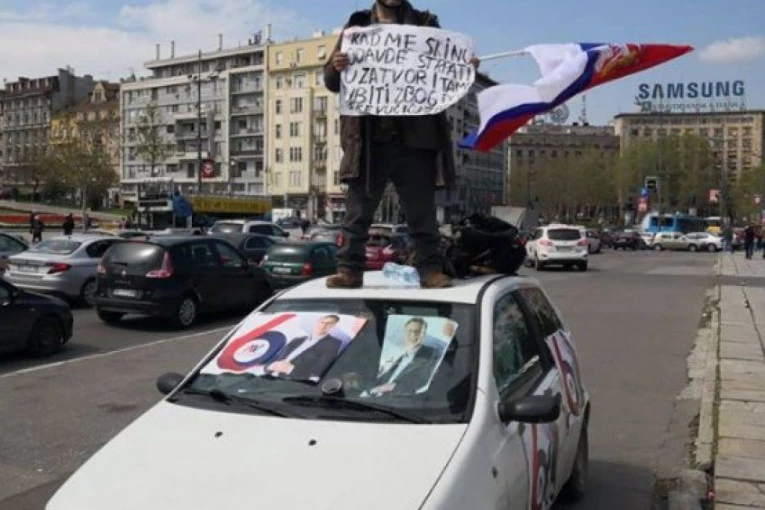 Čovek u zimskoj jakni i sa šlemom na glavi, te transparentom na kojem je nečitko između ostalog pisalo "Kad me skinu odavde i strpati u zatvor zbog podrške Vučiću...", stajao je na krovu automobila sa tablicama Velike Plane, koji je bio oblepljen Vučićevim predizbornim plakatima.
