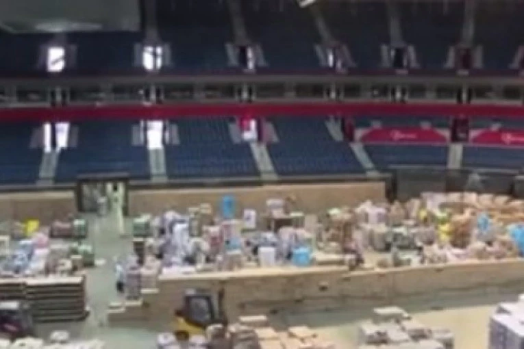 Foto: facebook.com/Kristina Kaplanović/TV Prva/printskrinDo danas iz Arene je izašlo skoro 50.000 paketa uz disciplinovan, brz i efikasan rad volontera.