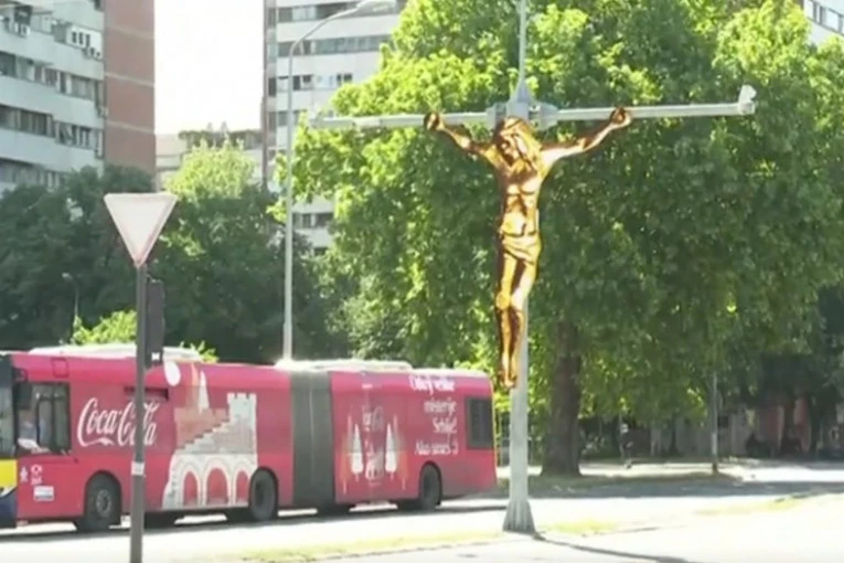 Na uglu ulica Jurija Gagarina i Doktora Ivana Ribara, na skretanju tramvaja i autobusa na kraju Bloka 45 ka krajnjoj stanici, sanjive Novobeograđane jutros je rasanio nesvakidašnji prizor - Isus Hrist razapet na banderi!