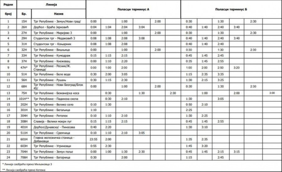 SVE NOĆNE LINIJE15N Trg republike - Zemun 26N Dorćol - Braće Jerković 27N Trg republike - Mirijevo 3 29N Studentski trg - Medaković 3 31N Studentski trg - Konjarnik 32N Trg republike - Višnjica 33N Trg republike - Kumodraž 37N Trg republike - Kneževac 47N Trg republike - Resnik 51N Trg republike - Bele vode 56N Trg republike - Rušanj 68N Trg republike - Blok 45 75N Trg republike - Bežanijska kosa 101N Trg republike - Padinska skela 202N Trg republike - Veliko selo 301N Trg republike - Begaljica 304N Trg republike - Ritopek 308N Slavija - Veliki mokri lug 401N Dorćol - Pinosava 511N Trg republike - Sremčica 601N Savski trg - Dobanovci 603N Trg republike - Ugrinovci 704N Trg republike - Zemun polje 706N Trg republike - Batajnica |
