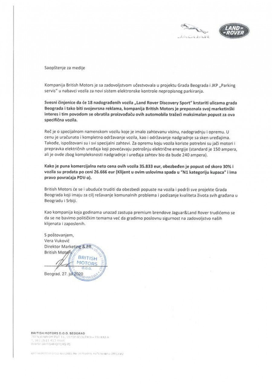 Foto: Grad Beograd- Svesni činjenice da će 18 nadograđenih vozila "Land Rover Discavery Sport" krstariti ulicama grada Beograda i tako biti svojevrsna reklama, kompanija "British Motors" prepoznala je svoj marketinški interes i tim povodom se obratila proizvođaču ovih vozila tražeći maksimalan popust za ova specifična vozila - navodi se u saopštenju.