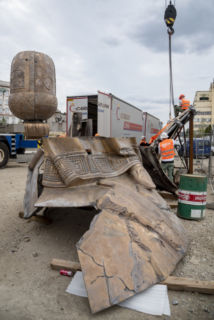 Brojne novinarske ekipe dočekale su danas na Savskom trgu nova četiri kamiona koja su dovezla delove vizantijskog šlema koji će biti postament impozantnog spomenika Stefanu Nemanji.