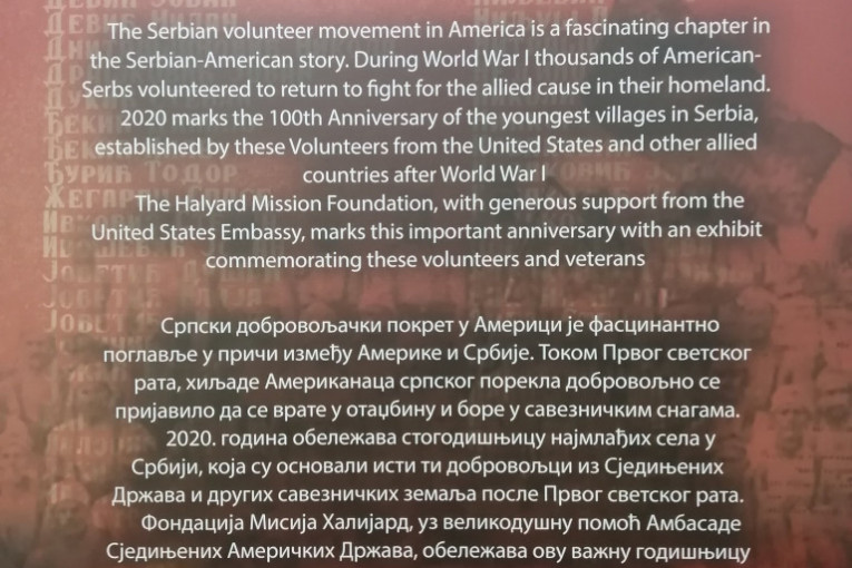Foto: Grad BeogradIzložba, koju je organizovala Fondacija misija Halijard, postavljena je povodom obeležavanja stogodišnjice od nastanka sela koja su osnovali i naselili srpski dobrovoljci koji su došli iz Sjedinjenih američkih država da se bore za Srbiju u Prvom svetskom ratu.