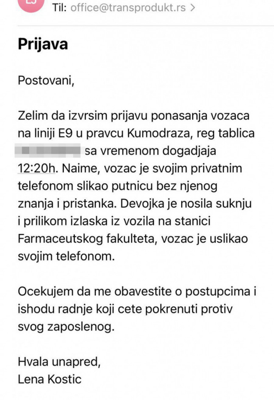 Vozač autobusa privatnog autoprevoznika "Transprodukt" koji saobraća na liniji E9 Kumodraž-Studentski Trg slikao je privatnim mobilnim telefonom putnicu koja je nosila suknju dok je izlazila iz autobusa.