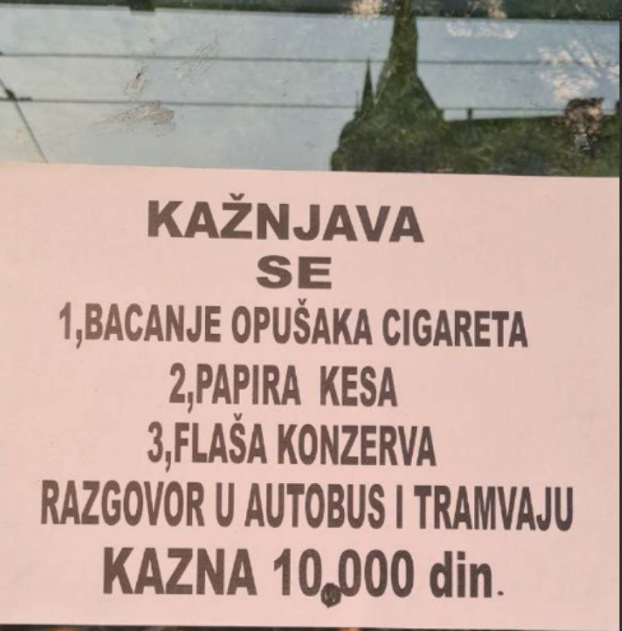 Na veliki broj stajališta gradskog prevoza u Beogradu prethodnih dana nalepljena je, malo je reći čudna, upozoravajuća poruka u kojoj se građanima preti kaznama od čak 10.000 dinara ukoliko budu bacili opuške cigareta, papirne kese i ambalažu, ali je u njoj naglešeno da ista sankcija čeka i sve ljude koji budu razgovarali u autobusima i tramvajima!?