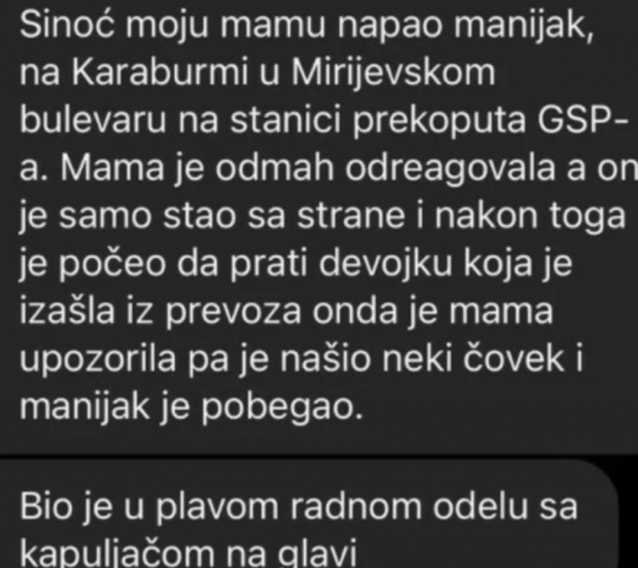 - Sinoć je moju mamu napao manijak na Karaburmi u Mirijevskom bulevaru na stanici preko puta GSP -a. Mama je odmah odreagovala, a on je samo stao sa strane i nakon toga krenuo da prati drugu devojku koja je izašla iz prevoza. Mama ju je upozorila pa je naišao i neki čovek i manijak je pobegao - napisala je ćerka žene.