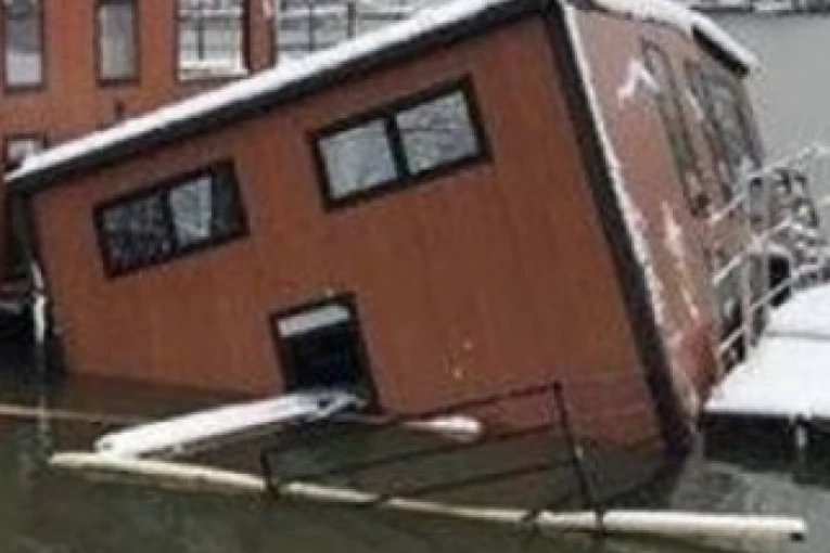 Na gornjem špicu Ade Međice u Beogradu, delimično je potonula splav kućica, za koju je vezan gliser.