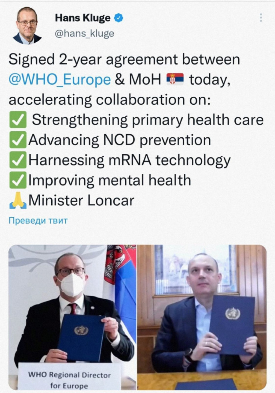 Značaj ove saradnje i potpisanog Sporazuma potvrdio je i direktor WHO dr Kluge koji je na svom tviter nalogu objavio i video o potpisivanju Sporazuma sa ministrom Lončarom.