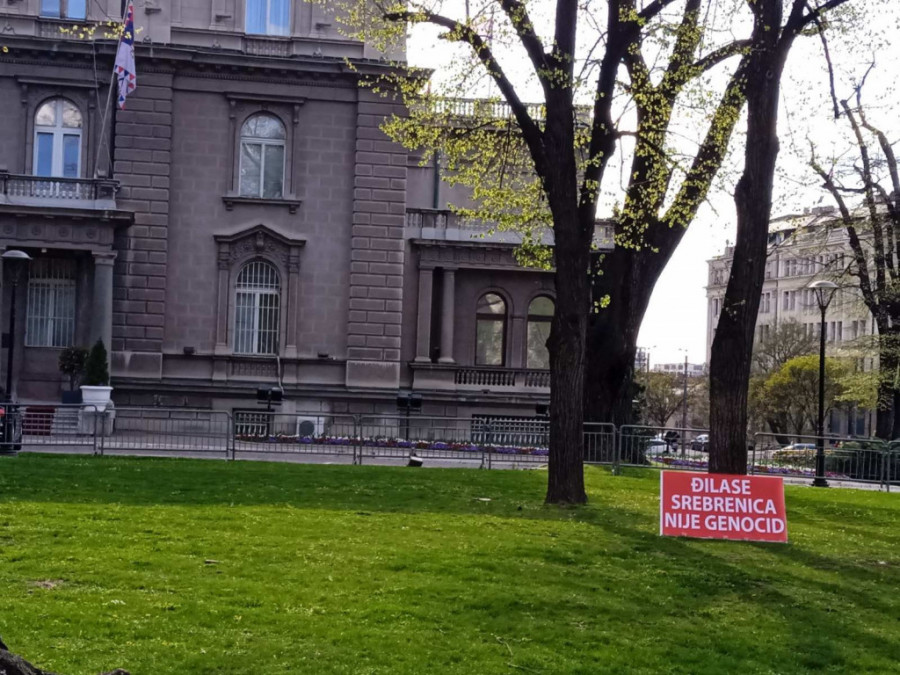Ranije je ispred Predsedništva postavljen transparent "Đilase, Srebrenica nije genocid", zbog ranijih navođenja da je u Srebrenici bio genocid.