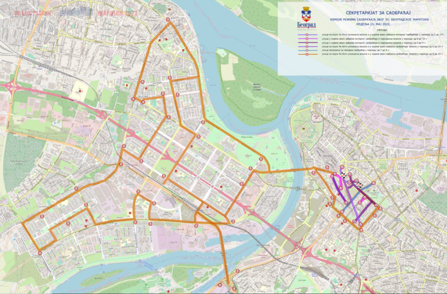 Izmene režima saobraćaja i obustave saobraćaja na trasama maratona, polumaratona i trke zadovoljstva, kao i na svim prilazima trasa vršiće se u skladu sa dinamikom prolaska takmičara, i to od 8 do 14 časova: Bulevar kralja Aleksandra, Beogradska, Slavija, Nemanjina, Balkanska, Gavrila Principa, Pop Lukina, Brankov most, Bulevar Mihajla Pupina, Bulevar Nikole Tesle, Džona Kenedija, Bulevar umetnosti, Bulevar Milutina Milankovića, Antifašističke borbe, Most na Adi, Milentija Popovića, Brankova, Zeleni venac, Kraljice Natalije, Kneza Miloša, Kralja Milana i Terazije