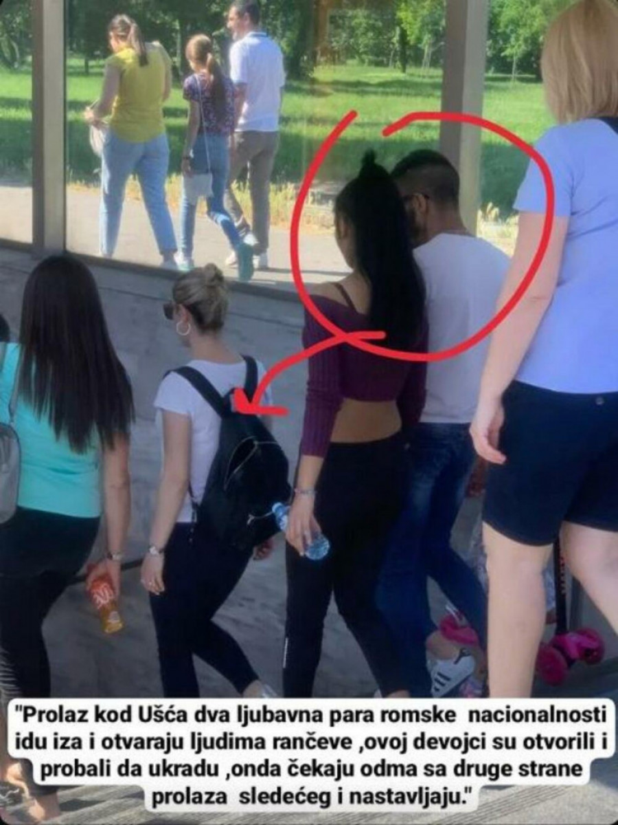 - Prolaz kod Ušća dva ljubavna para romske nacionalnosti idu iza i otvaraju ljudima rančeve, ovoj devojci su otvorili i probali da ukradu, onda čekaju odmah sa druge strane prolaza sledećeg i nastavljaju - piše u objavi očevidaca.