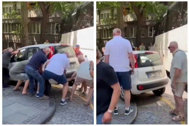 Grupa ljudi skupila se i rešila da pomeri mali beli automobil marke Fiat, koji je stajao nepropisno parkiran, oslanjajući se sa samo dva točka sa leve strane na trotoar.