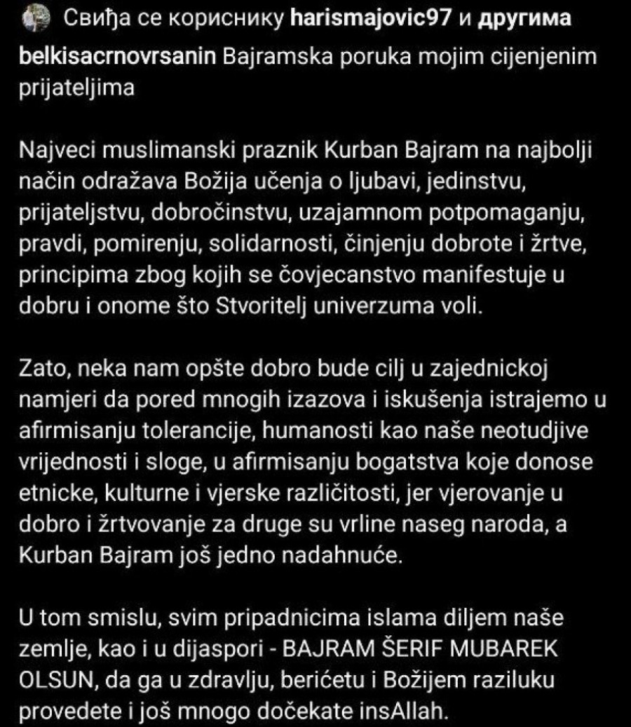 - Najveći muslimanski praznik Kurban Bajram na najbolji način odražava Božija učenja o ljubavi, jedinstvu, prijatelkjstvu, dobročinstvu, uzajamnom potpomaganju, pravdi, pomirenju, solidarnosti, činjenju dobrote i žrtve, principima zbog kojih se čovečanstvo manifestuje u dobru i onome što Stvoritelj univerzuma voli - napisala je treća žena pokojnog Muamera Zukorlića.