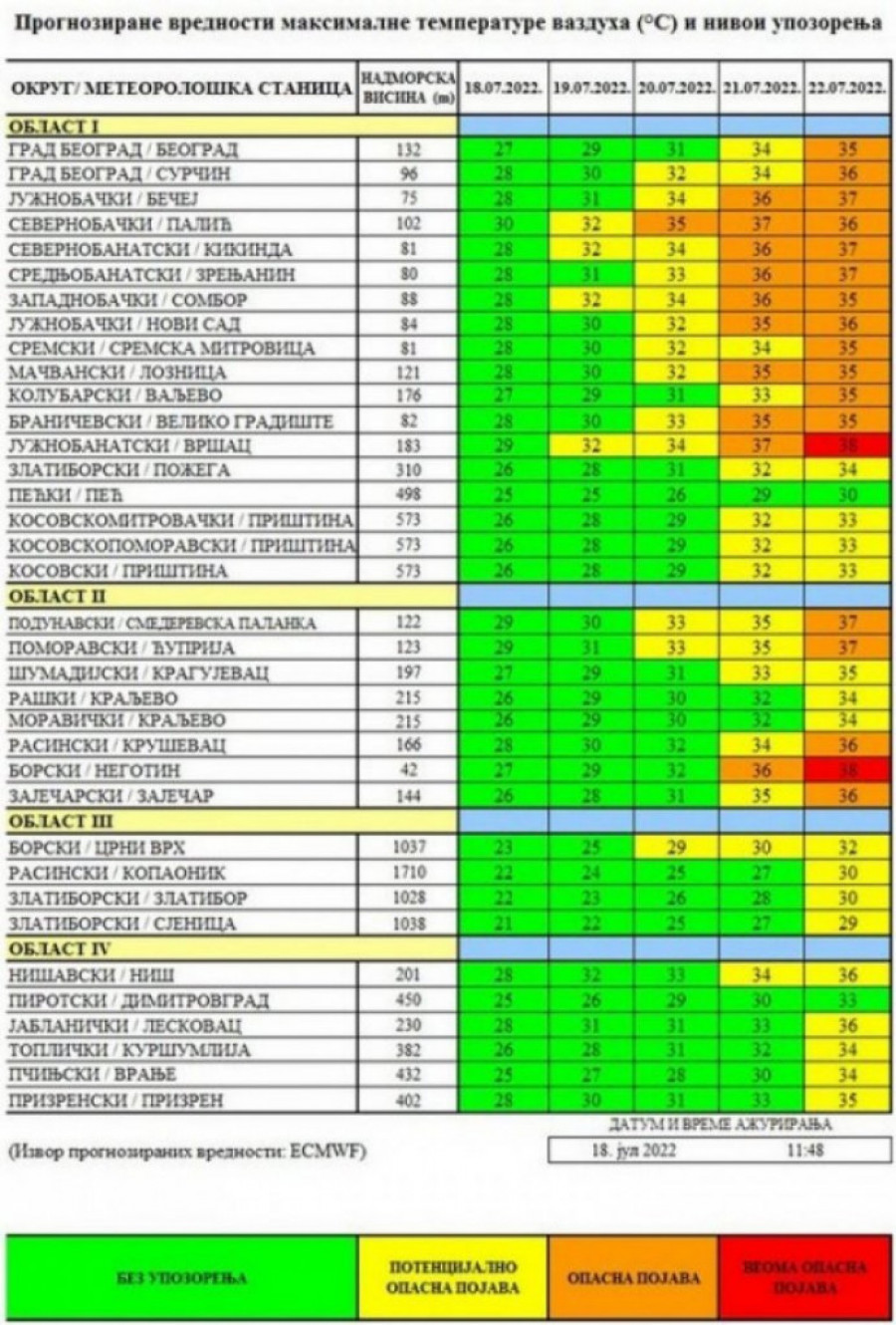 Kako se dodaje, od 21. do 23. jula maksimalne dnevne temperature vazduha biti u domenu opasne pojave, na severu, kao i na jugu zemlje. U objavljenoj "Batutovoj" tabeli, najopasnije vreme po zdravlje biće 21. i 22. jula. Tada preovladava narandžast boja, što znači da je pojava opasna, a 22. jula u dva grada - odnosno u Vršcu i Negotinu, biće crveni alarm odnosno veoma opasna pojava.