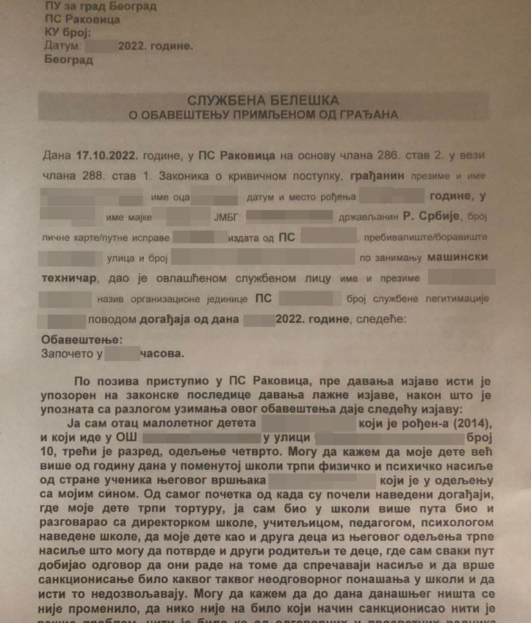 - Moj sin nije jedino dete koje trpi vršnjacko nasilje. Škola je već imala tih problema i ranije, ali se po tom pitanju ni tad ništa nije uradilo. Prošlog polugodišta pisali smo peticiju, ali se nismo makli sa mrtve tačke. Moje dete je udarao u stomak, izgubilo je dah, i sve to pred očima učiteljice koja nije uopšte odreagovala - razočarano navodi otac maltretiranog dečaka.