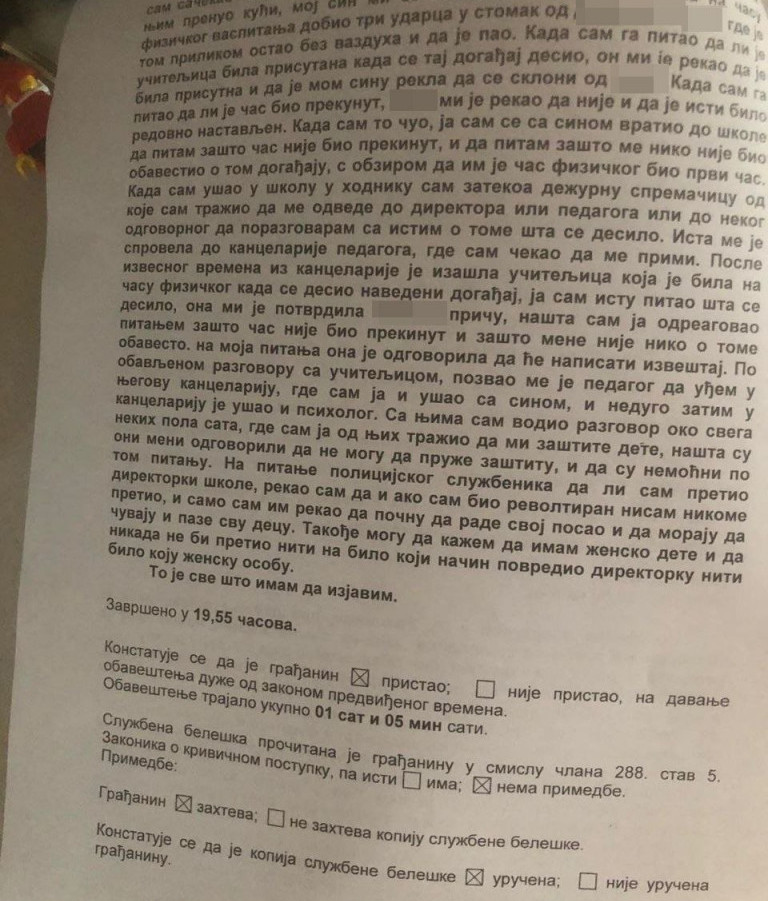 - Učiteljica je potvrdila priču mog sina, na šta sam odreagovao pitanjem zašto čas nije prekinut. Ona je odgovorila da će napisati izveštaj - kaže se u službenoj belešci.