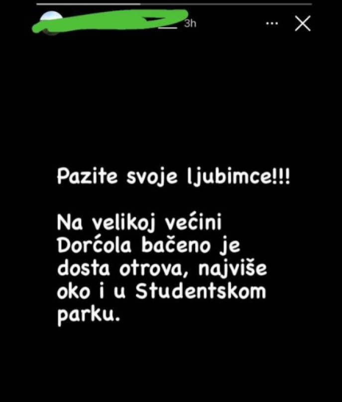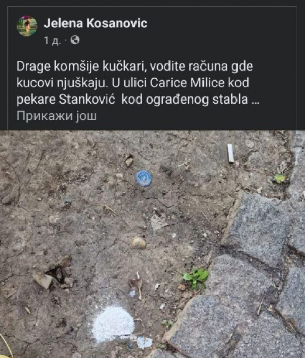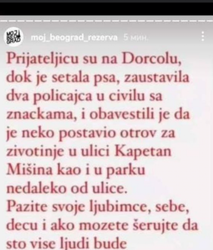 - Prijateljicu su na Dorćolu dok je šetala psa zaustavila dva policajca u civilu sa značkama i obavestili je da je neko postavio otrov za životinje u ulici Kapetan Mišina, kao i u parku nedaleko od ulice. Pazite svoje ljubimce, sebe, decu i ako možete, šerujte da što više ljudi bude upozoreno na vreme - pisalo je u jednoj od objava na Instagramu.