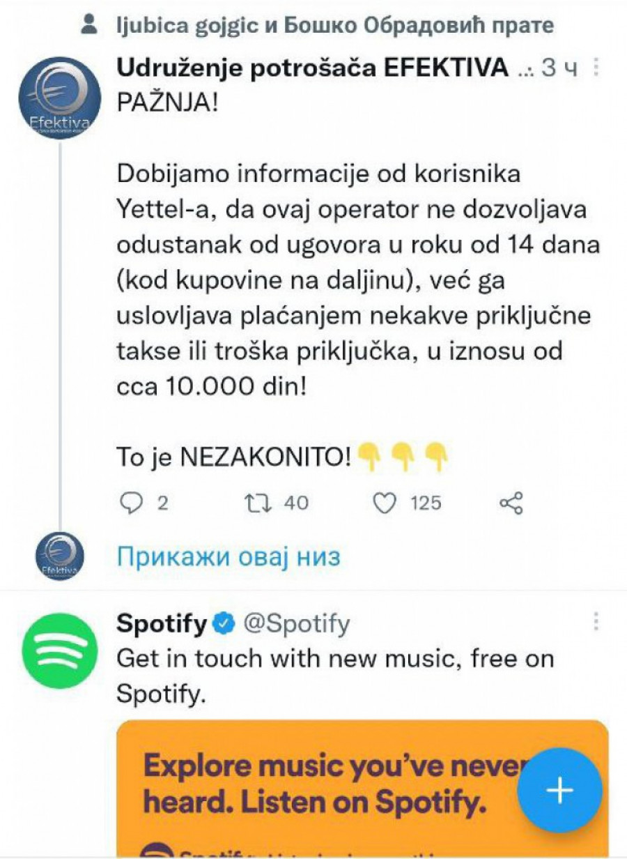 - Javljaju nam neki ljudi, pišu o tome, da im nude na potpisivanje ugovora na daljinu. To je kad ne odu u poslovnicu, nego preko telefona prave dogovor, onda oni pošalju da se to potpiše. Krene se sa tim, korisnik shvati da mu ne odgovara, ne sviđa mu se, hoće da poništi taj ugovor, a onda tu stupa na snagu njihova nezakonita praksa, a to je traženje plaćanja priključne takse u iznosu od 10.000 dinara. Kad je potpisan ugovor na daljinu tu mora rok od 14 dana da se primeni, i korisnik ne treba nikakve troškove da snosi. Na sve to, priključna taksa je nezakonita - objašnjava Gavrilović.