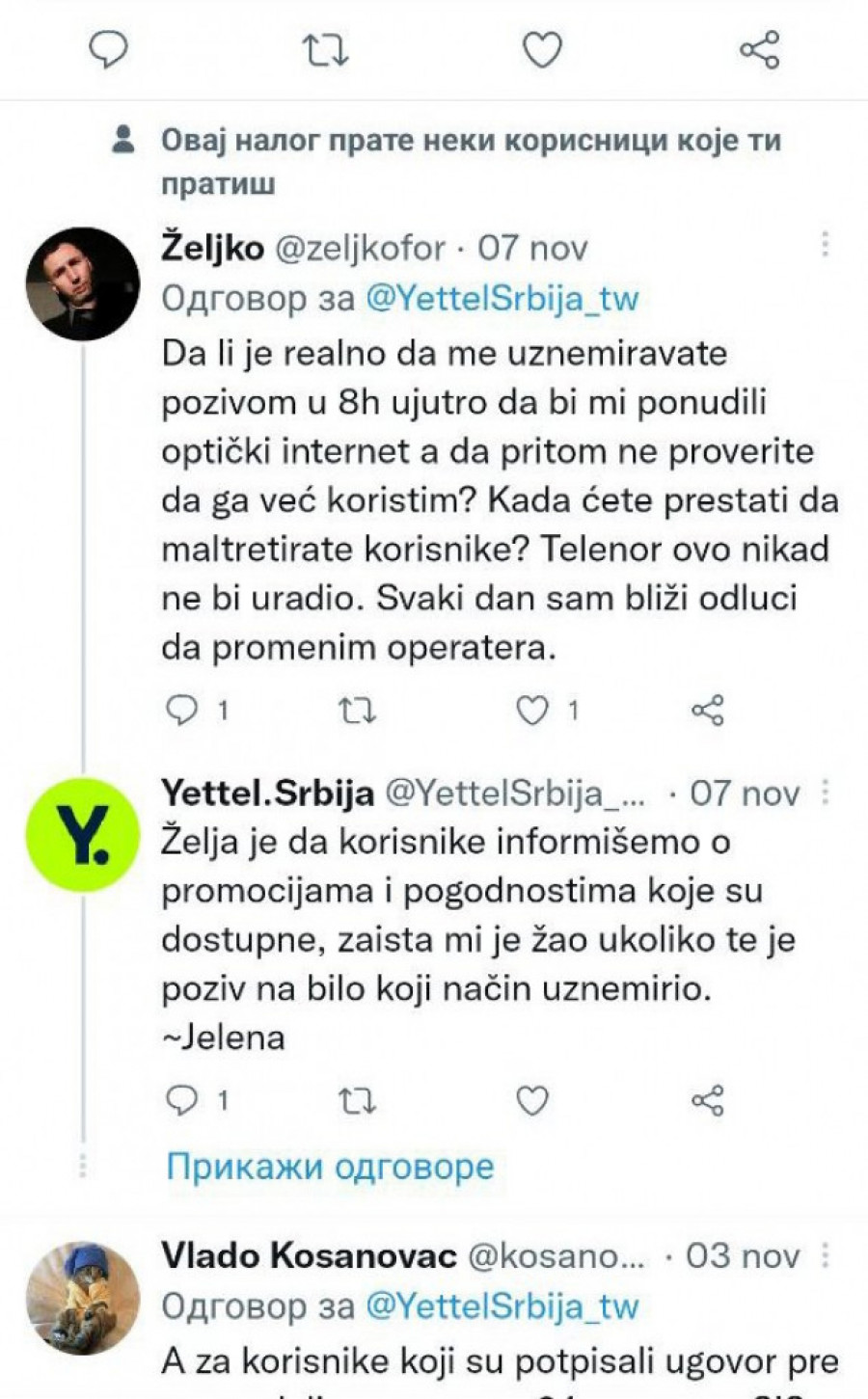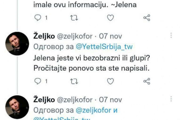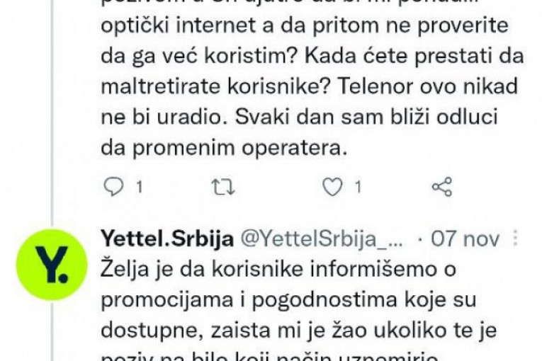 - Da li je realno da me uznemiravate pozivom u osam ujutru da biste mi ponudili optički internet, a da pritom ne proverite da ga već koristim? Kada ćete prestati da maltretirate korisnike? Telenor ovo nikad ne bi uradio. Svaki dan sam bliži odluci da promenim operatora - naveo je Željko.