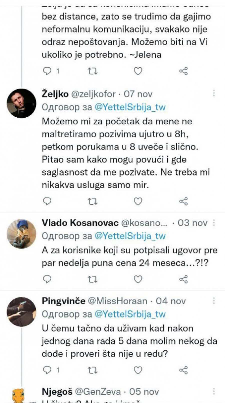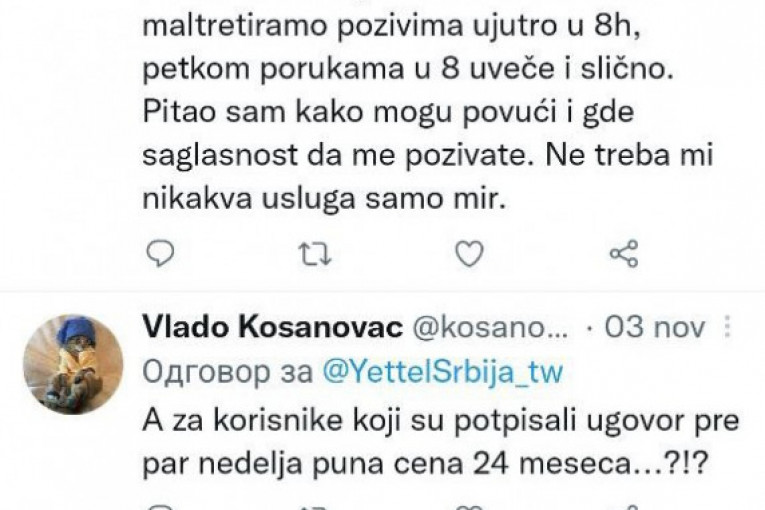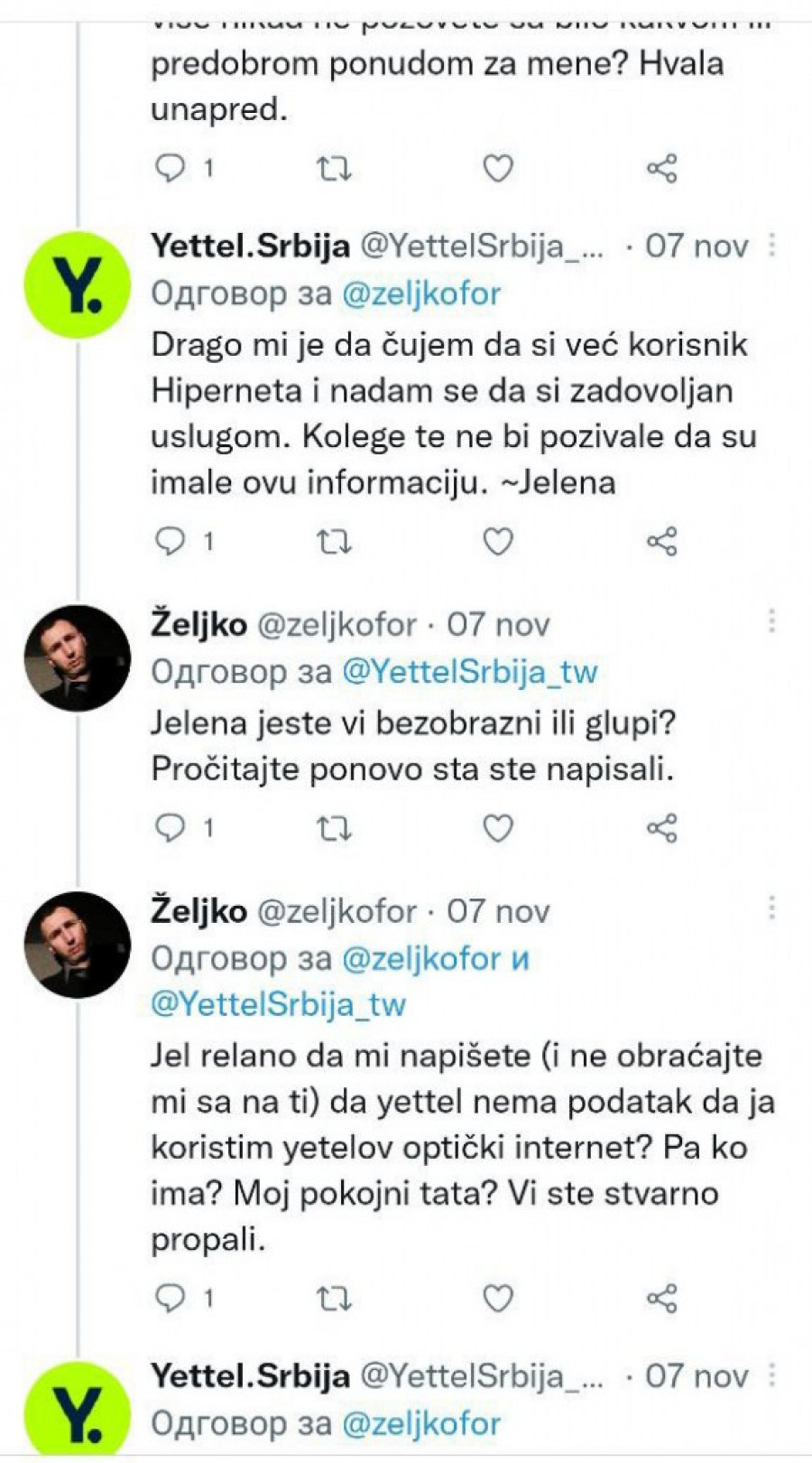 U jednom od Tvitova, korisnik ove društvene mreže, upisan kao Željko, objasnio je da je očajan time što ga ova kompanija uznemirava kako bi mu nudila Hipernet, koji je on već aktivirao.