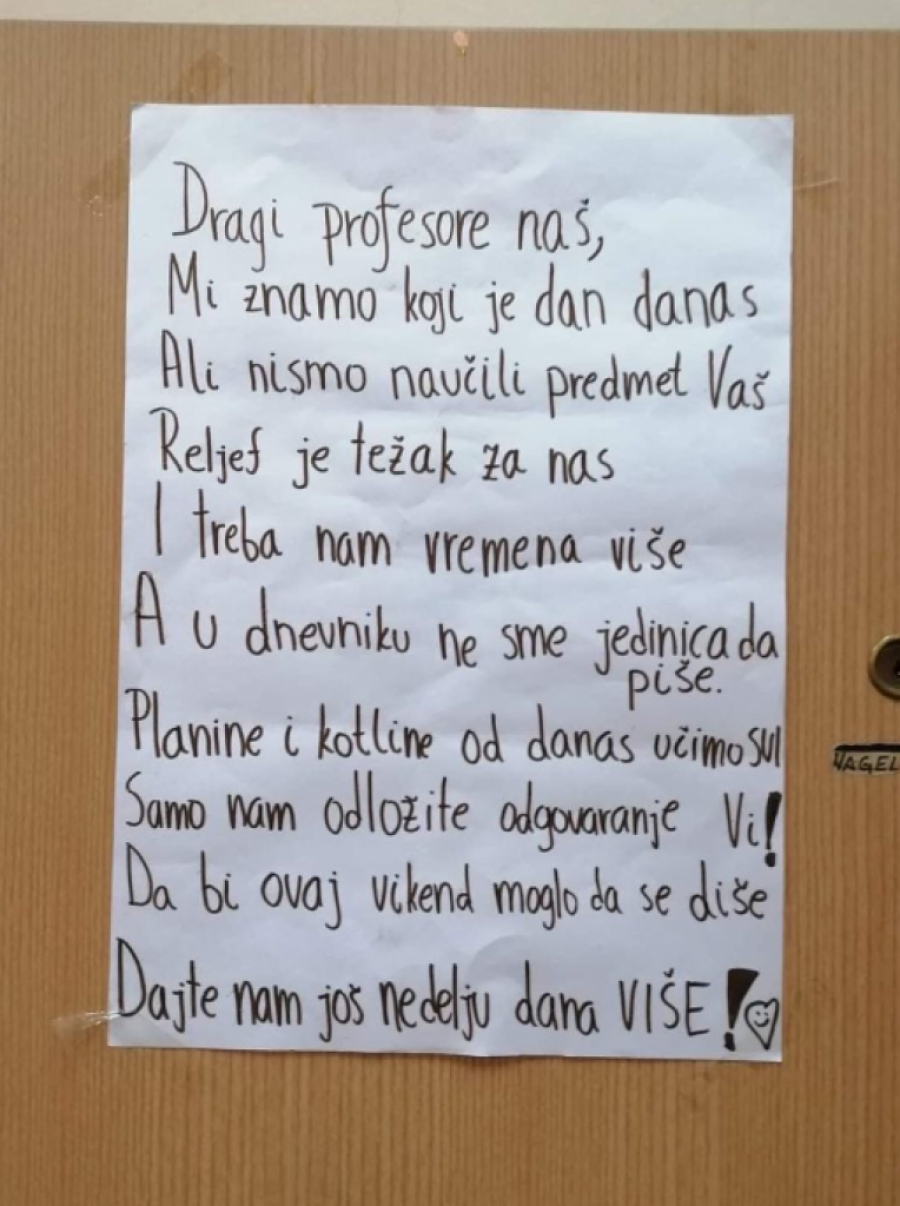 - Došle su dve devojke i predale mi papir sa pesmicom. Pročitao sam je, zahvalio i nastavio sa časom. To su dobra su deca. S obzirom na to da je reč o učenicima društvenog smera, razumem ih što im je trebalo dodatno vreme za učenje gradiva. Nisam im predavao prve dve godine, pa im verovato treba vremena da se naviknu na mene i način mog predavanja, ali i ispitivanja, Tražili su odlaganje na vrlo neobičan i originalan način i ja sam ga odložio . Nije mi cilj da ih pošto poto ispitam i podelim ocene, nego da nauče gradivo koje, ako ništa drugo, trebaju da znaju zbog sebe i svoje opšte kulture - kaže profesor za Subotičke.rs.