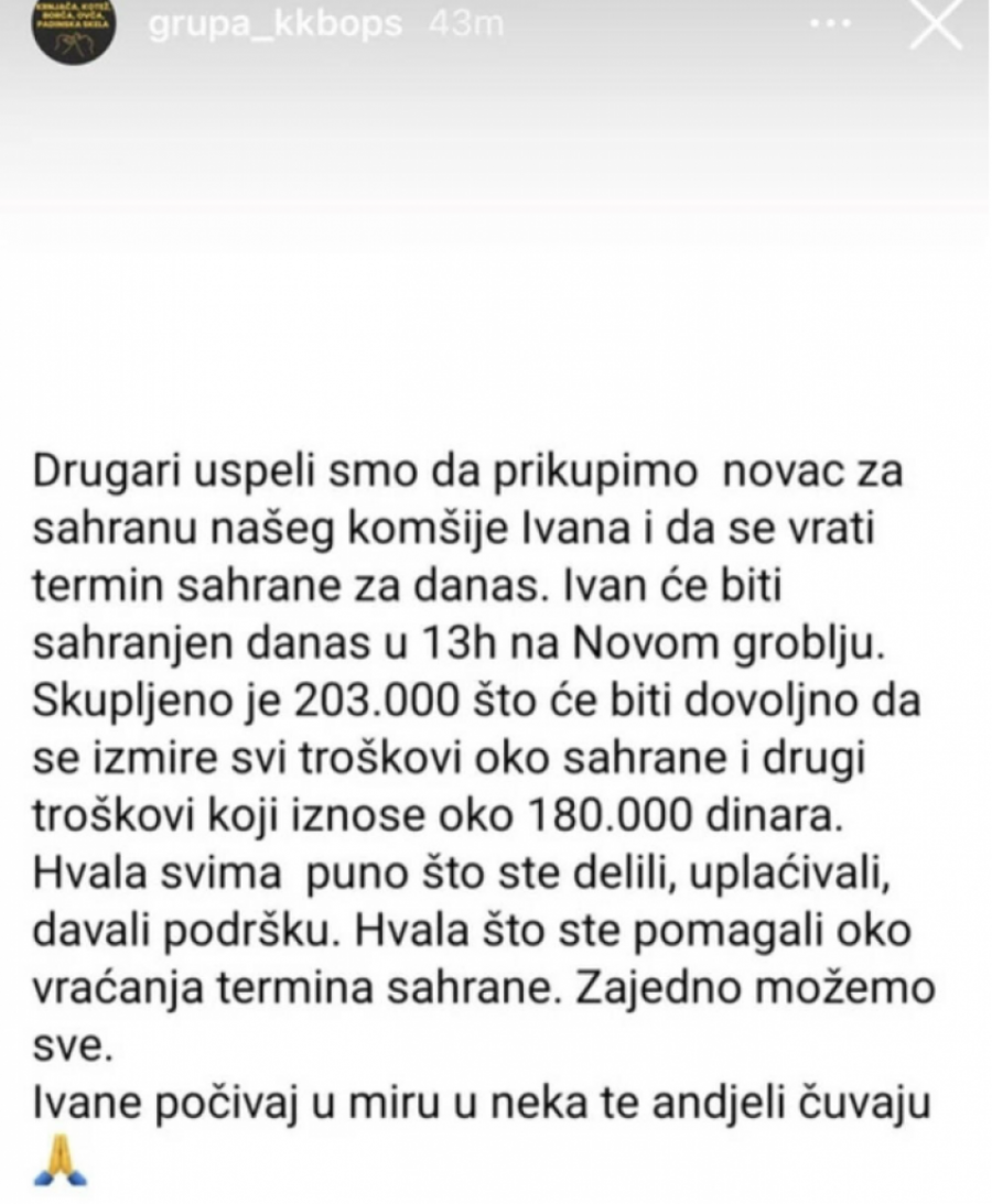 "Drugari uspeli smo da prikupimo novac za sahranu našeg komšije Ivana i da se vrati termin sahrane za danas. Ivan će biti sahranjen u 13h na Novom groblju. Skupljeno je 203.000 dinara što će biti dovoljno da se izmire troškovi oko sahrane i drugi troškovi koji iznose oko 180.000 dinara. Hvala svima puno što ste delili, uplaćivali, davali podršku. Hvala što ste pomogli oko vraćanja termina sahrane. Zajedno možemo se. Ivane, počivaj u miru, i neka te anđeli čuvaju", navodi se u obaveštenju stranice koja je objavljeno jutros oko osam časova, prenosi Blic.