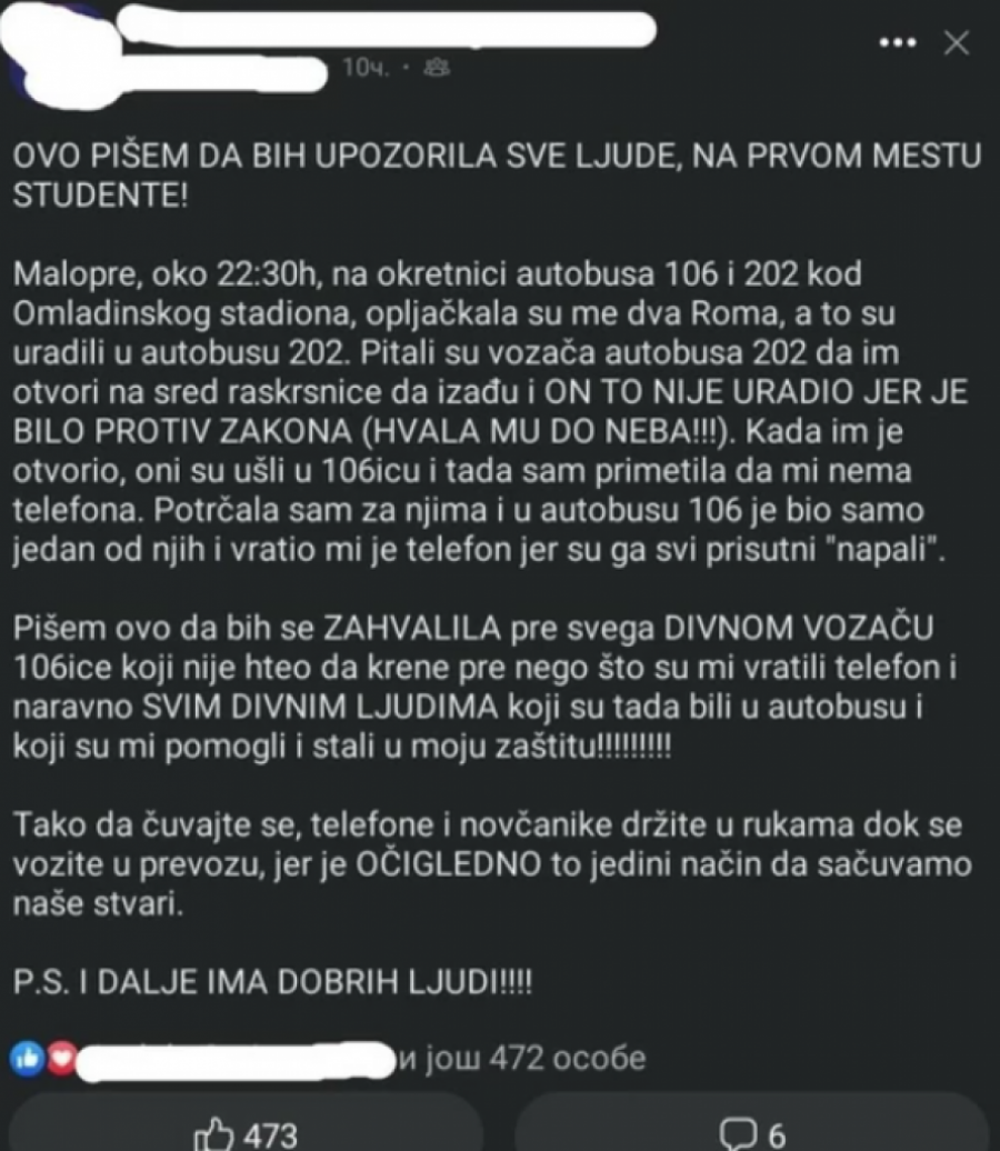 - Malopre, oko 22:30 sati, na okretnici autobusa 106 i 202 kod Omladinskog stadiona, opljačkala su me dva muškarca, a to su uradili u autobusu 202. Pitali su vozača autobusa 202 da im otvori nasred raskrsnice da izađu i on to nije uradio jer je bilo protiv zakona. Hvala mu do neba - počela je studentkinja i dodala: