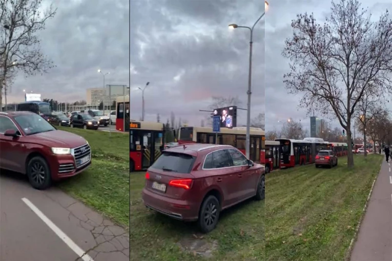Kako se može videti na snimku, automobil marke "audi", zaobilazio je preko travnjaka saobraćajni kolaps.