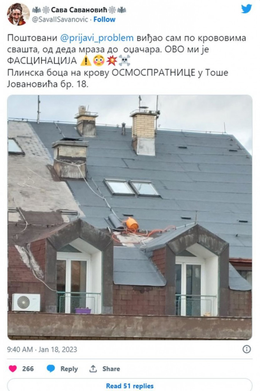 - Poštovani, viđao sam po krovoima svašta, od Deda Mraza do odžačara. OVO mi je FASCINACIJA. Plinska boca na krovu OSMOSPRATNICE u Toše Jovanovića 18 - stoji u objavi korisnika društvene mreže Tviter.