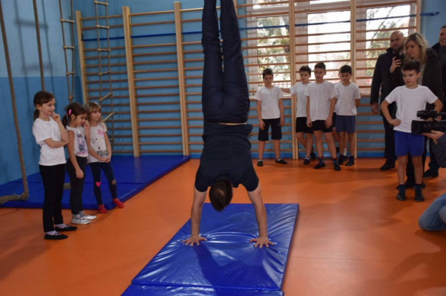 Siniša Mali juče je obišao rekonstruisanu salu za gimnasitiku u osnovnoj školi "Gavrilo Princip" u Zemunu, a tom prilikom je iskoristio priliku da uradi stoj na rukama i pokaže deci da su redovne fizičke aktivnosti neophodne za održavanje dobrog zdravlja i kondicije.