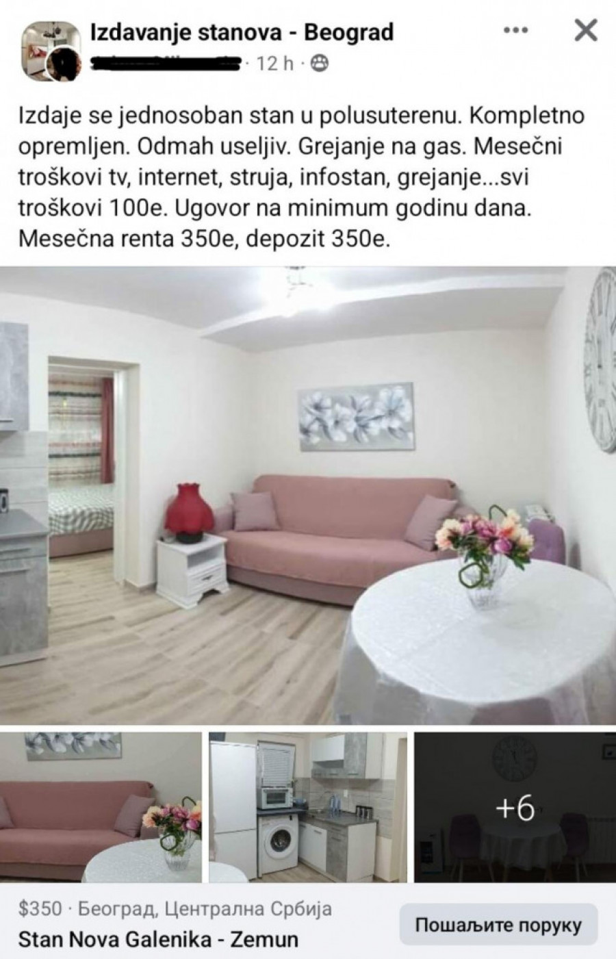 - Izdaje se jednosoban stan u polusuterenu. Kompletno opremljen. Odmah useljiv. Grejanje na gas. Mesečni troškovi tv, internet, struja, infostan, grejanje. Svi troškovi 100 evra. Ugovor na minimum godinu dana. Mesečna renta 350 evra, plus depozit 350 evra - navodi se u opisu oglasa u grupi "Izdavanje stanova - Beograd".