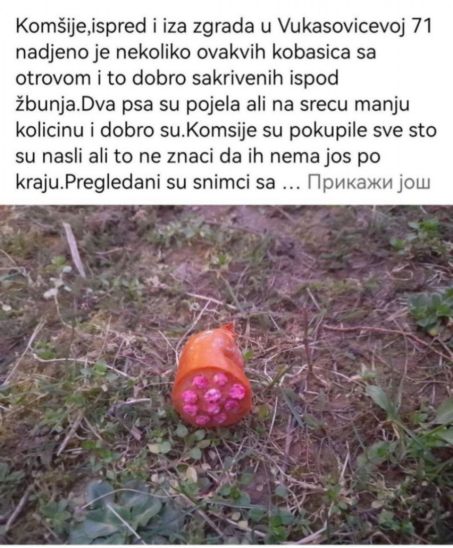 - Komšije, ispred i iza zgrade u Vukasovićevoj 71 nađeno je nekoliko ovakvih kobasica sa otrovom, i to dobro sakrivenih ispod žbunja - piše u objavi na Fejsbuku.