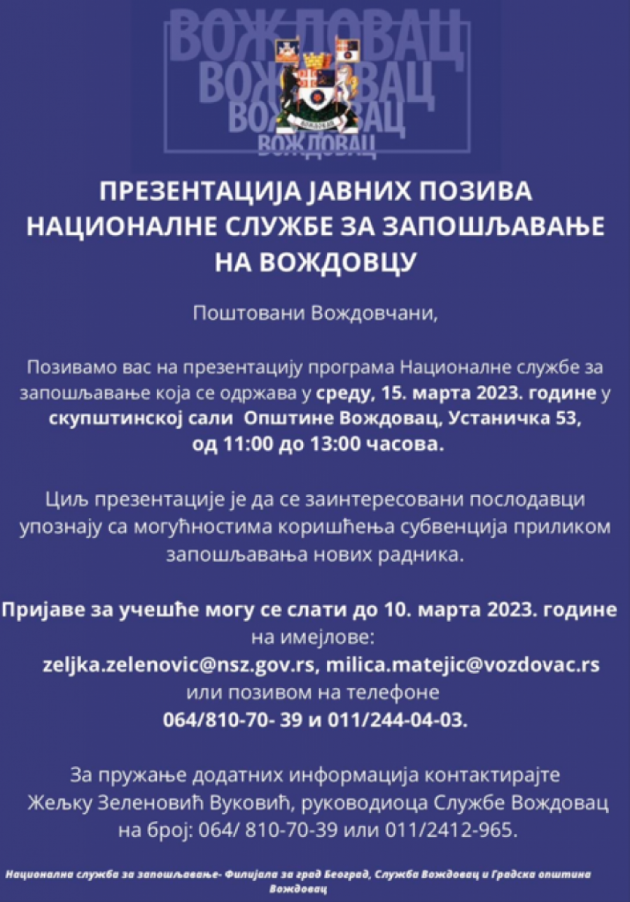 Prijave za učešće mogu se slati do 10. marta 2023. godine na imejlove: zeljka.zelenovic@nsz.gov.rs, milica.matejic@vozdovac.rs ili pozivom na telefone 064/810-70- 39 i 011/244-04-03.