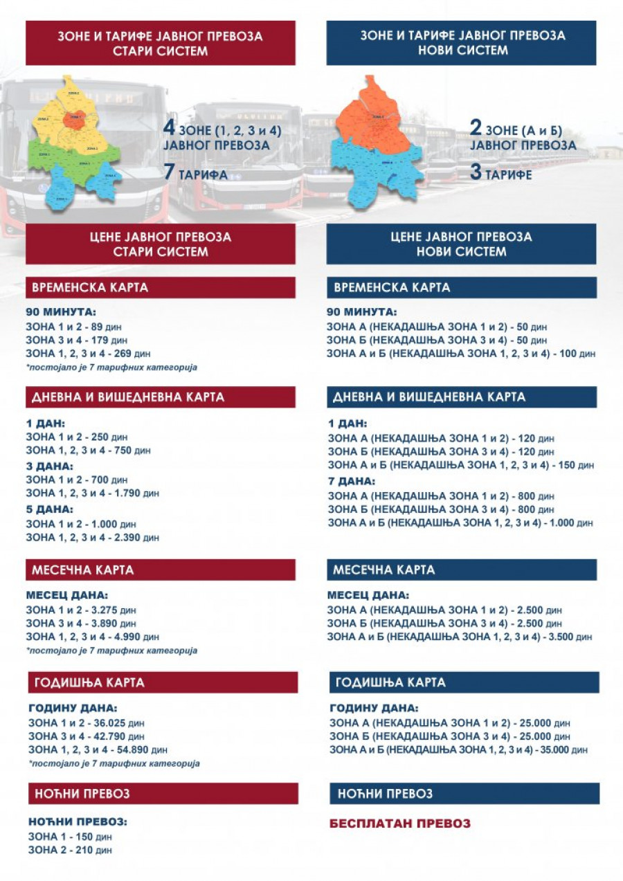 Kako je objasnio Šapić, celodnevna karta, koja će koštati 120 dinara, važiće od 4.00 ujutro do ponoći tog kalendarskog dana, a od ponoći do 4.00 ujutro narednog dana na snazi će biti besplatni noćni prevoz.
