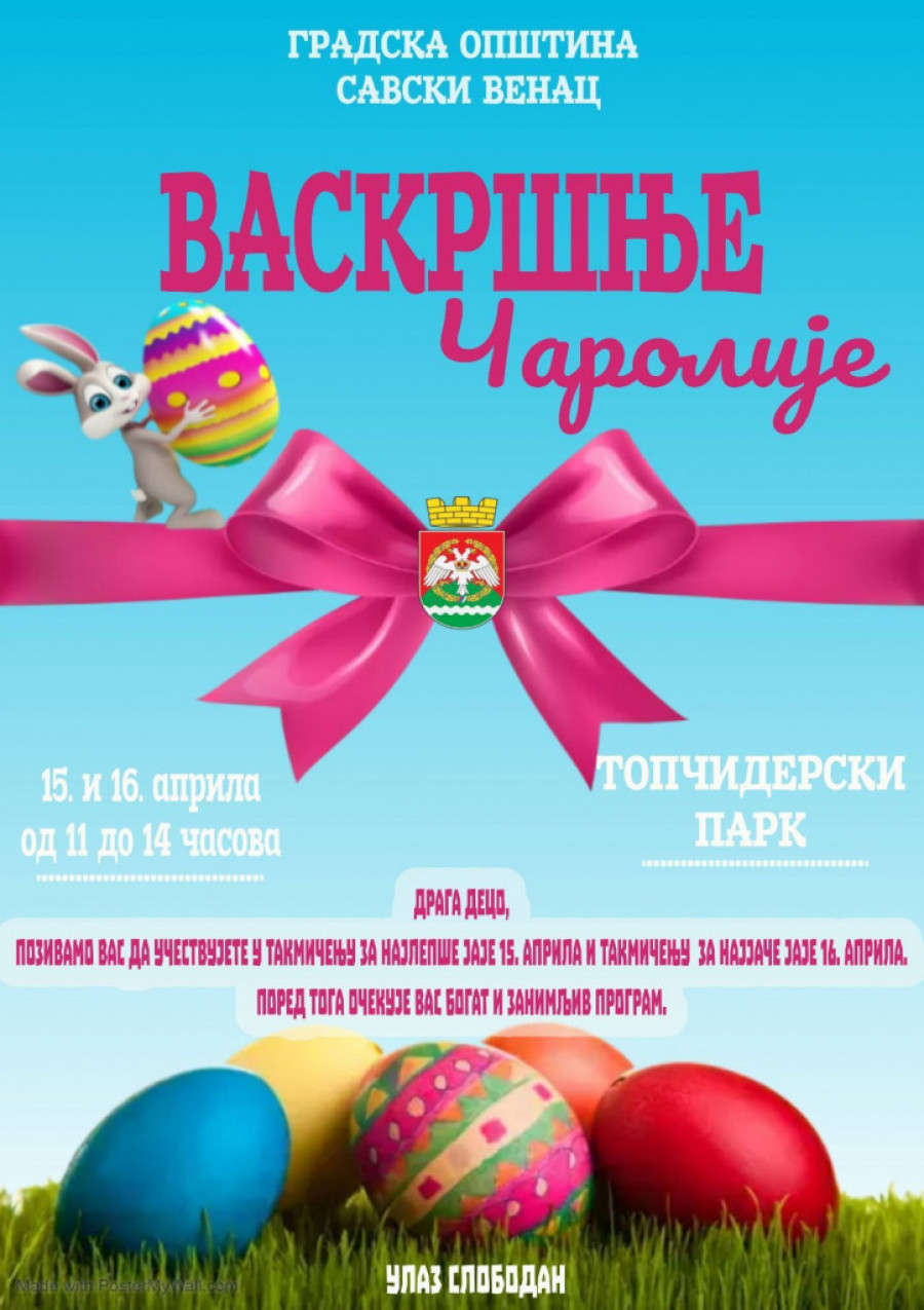 Opština Savski venac i ove godine organizuje manifestaciju „Vaskršnje čarolije“, koja će se održati 15. i 16. aprila ispred Konaka kneza Miloša u Topčiderskom parku.