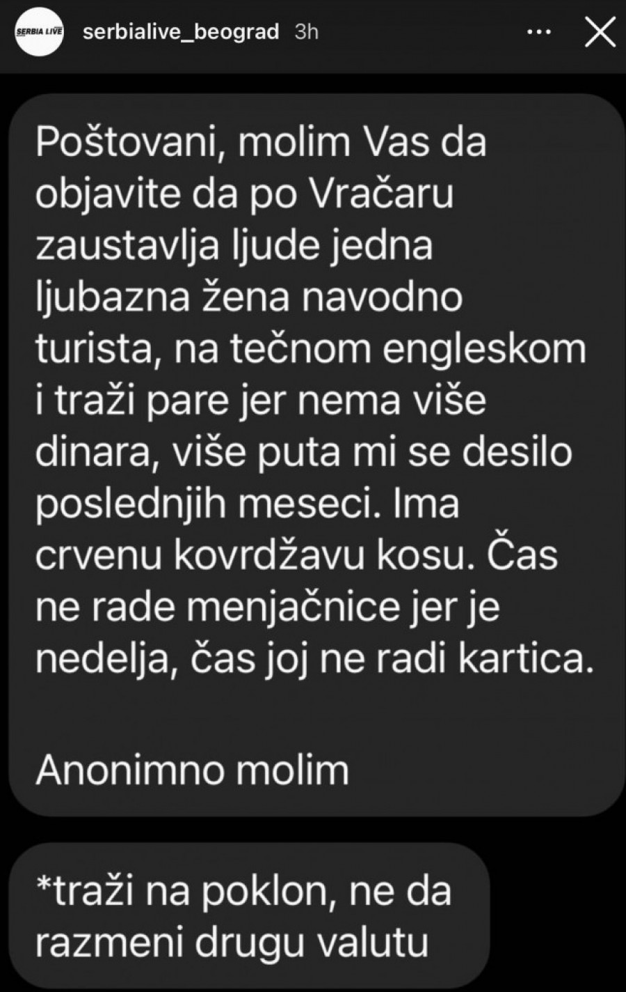 - Po Vračaru jedna ljubazna žena, navodno turista, zaustavlja ljude na tečnom engleskom traži pare jer nema više dinara, više puta mi se desilo poslednjih meseci. Ima crvenu kovrdžavu kosu. Čas ne rade menjačnice jer je nedelja, čas joj ne radi kartica. Novac traži na poklon, a ne da razmeni u drugu valutu - navodi se u upozorenje koje je objavljeno na stranici "Serbialive Beograd".