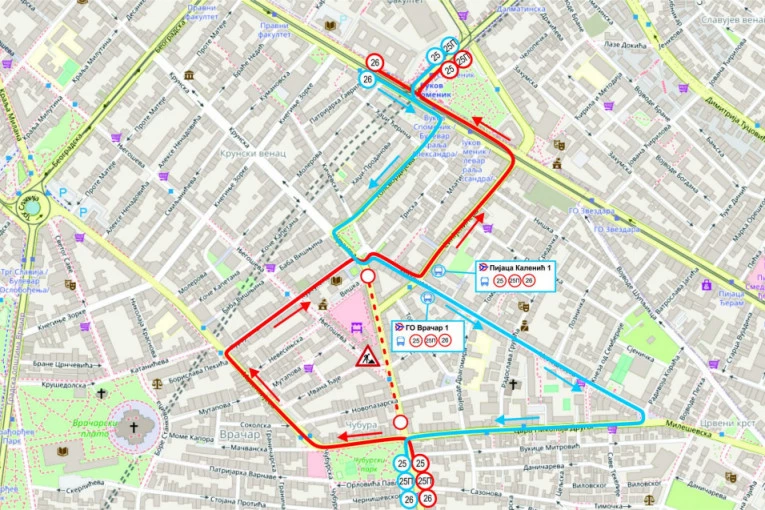 – vozila sa linija 25, 25P, 26 i 26N, u smeru ka gradu, saobraćaće sledećim ulicama: Maksima Gorkog, Cara Nikolaja II, Makenzijevom, Kursulinom, Krunskom, Trnskom, Mileševskom, Sinđelićevom i dalje redovnom trasom.