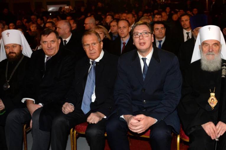 Predsednik Srbije Aleksandar Vučić i ministar spoljnih poslova Ruske federacije Sergej Lavrov došli su danas u Hram Svetog Save na Vračaru gde će se održati svečana prezentacija mozaika, na kupoli na visini od 65 metara, a predstavlja Hrista u činu vaznesenja na nebo.