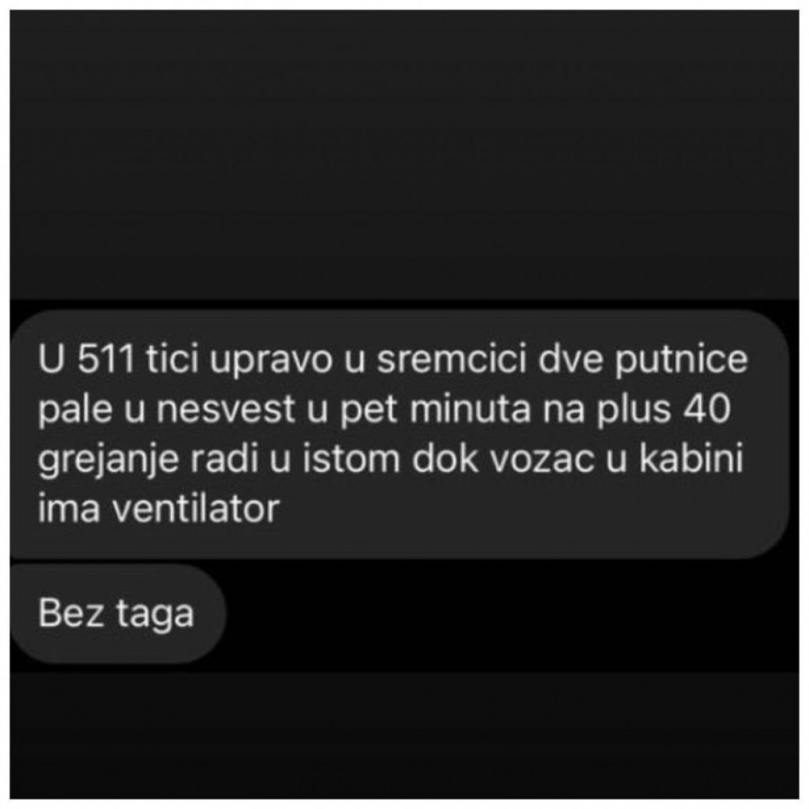 Prva dojava koja se pojavila ne mrežama, jeste da su se dve putnice na liniji 511 Beograd-Sremčica onesvestile u vozilu usled velike gužve i vrućine.