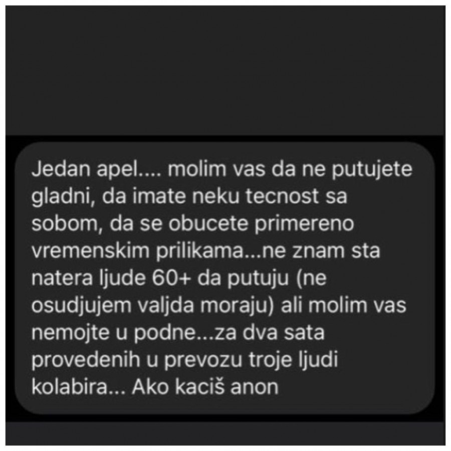 - Molim sve ljude da gladni i bez vode ne ulaze u vozila, pored velikih gužvi i enormne toplote, lako se desi da nam pozli. Ukoliko smo gladni ili žedni, veće su šanse da nam se sloši - glasio je apel sugrađanke.