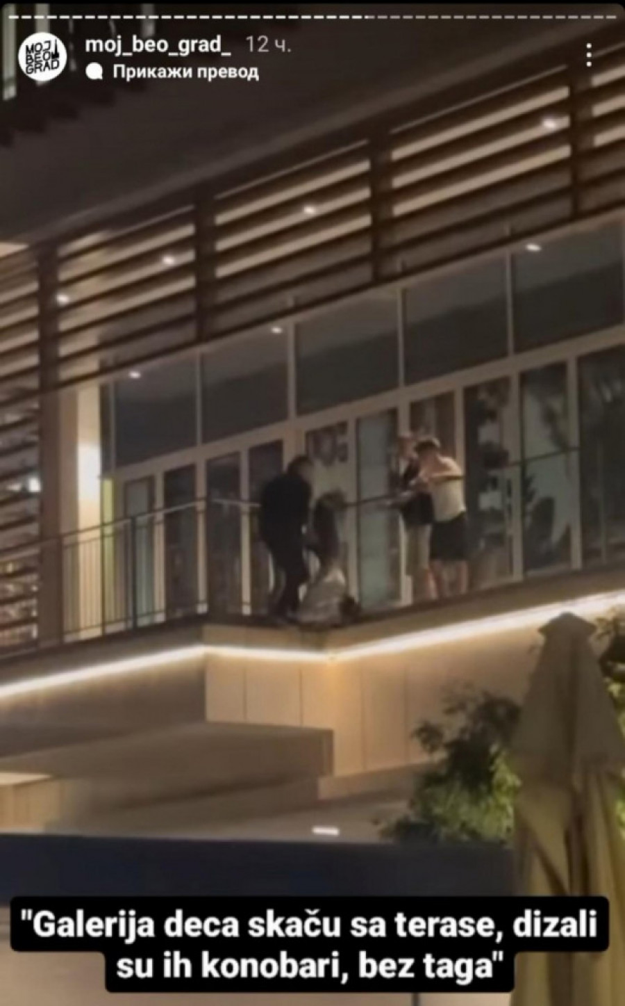 - Galerija, deca skaču sa terase, dizali su ih konobari - piše u objavi sa video-snimkom na kome se vide deca koja pokušavaju da skoče, ali i jedan muškarac koji ih vraća - kažu.