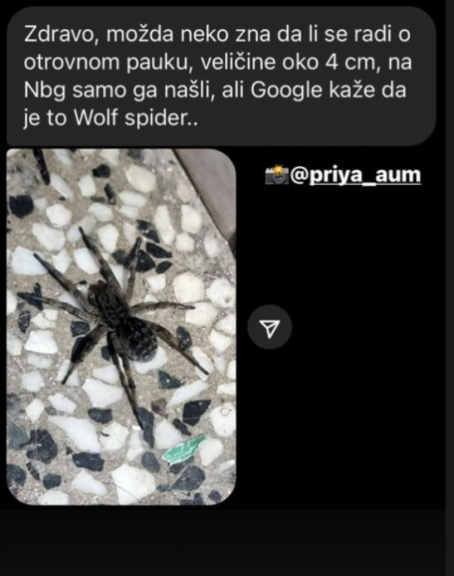 Na instagram stranici "serbia_live_beograd" pojavila se fotografija crno-sivog pauka - tarantule, koji je bio zatečen u zgradi na Novom Beogradu.