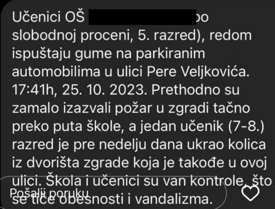 Na Instagram stranici "Serbialive Beograd" objavljena je poruka koja je upozorila javnost na ovaj gnusni čin. Uz poruku su priložene i fotografije na kojima se jasno vidi kako dečaci ispuštaju gume na parkiranim vozilima.