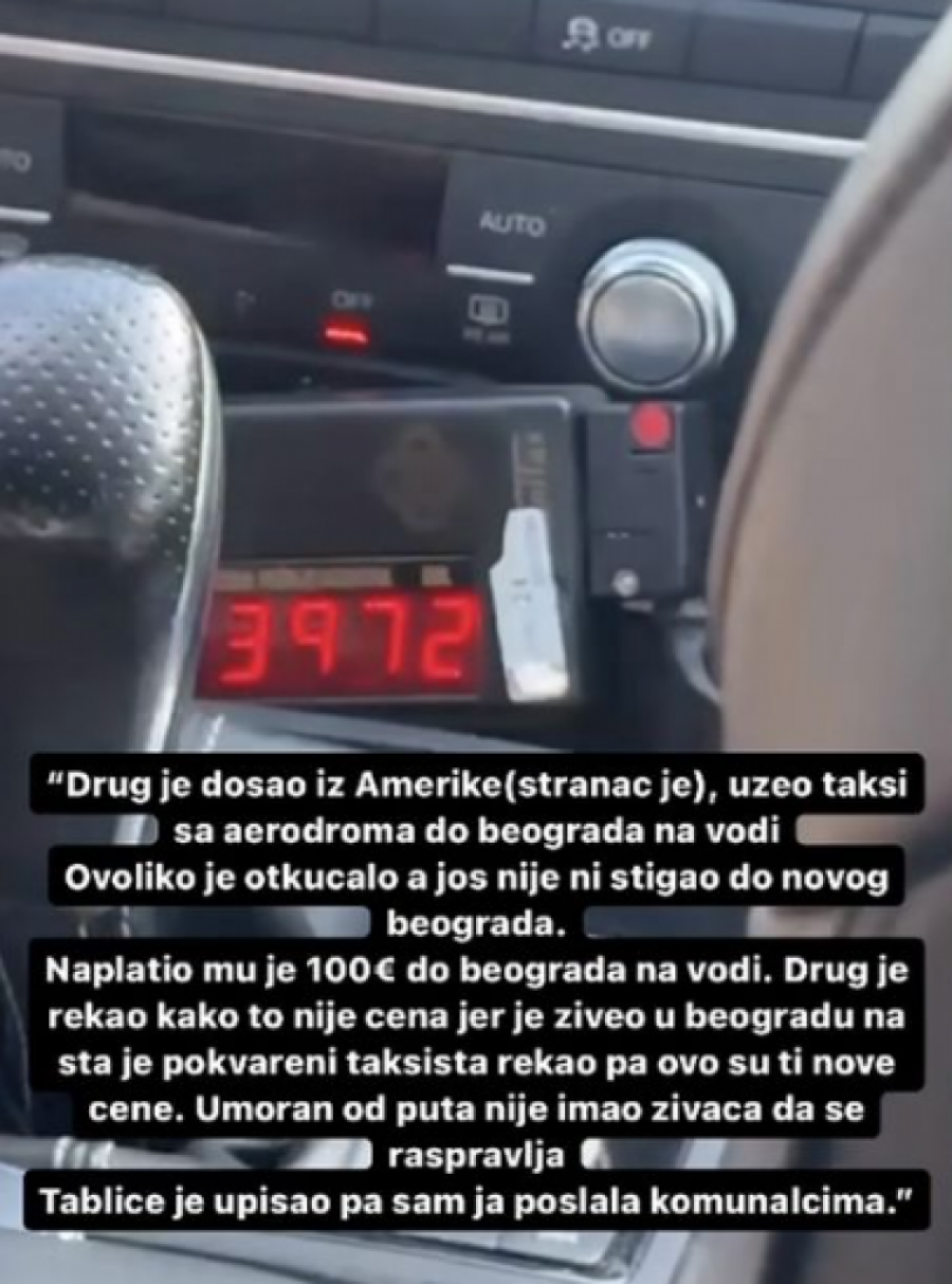 - Drug je došao iz Amerike (stranac je), uzeo taksi od aerodroma do Beograda na vodi. Ovoliko je otkucalo, a još nije ni stigao do Novog Beograda. Naplatio mu je 100 evra do Beograda na vodi. Drug je rekao kako to nije cena, jer je živei u Beogradu, na šta je pokvareni takstita rekao "pa ovo su ti nove cene. Umoran od puta, nije imao živaca da se raspravlja. Tablice je upisao, a ja sam poslala komunalcima - stoji u objavi.