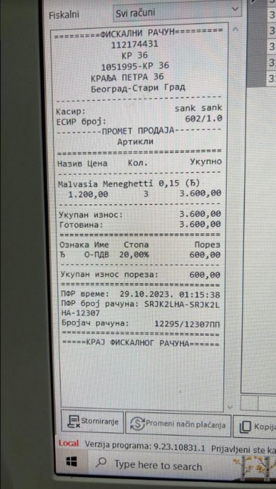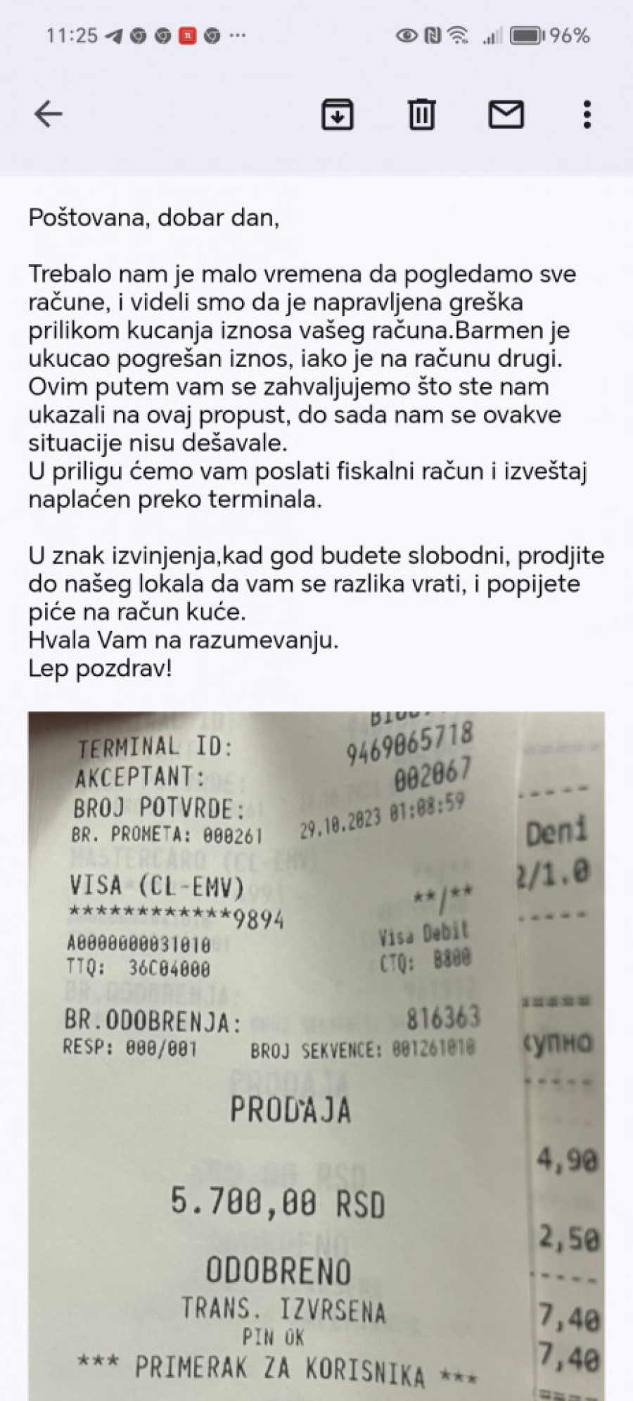 - Nakon svega ovoga je stigao odgovor da je došlo do greške, da je račun 3.600 dinara, da je barmen navodno otkucao pogrešan izbor, a poslali su mi i mejl s računom i slipom. Tu takođe postoji stvar koja mi nije jasna i koja bi mogla da ukazuje na to da račun koji mi je dostavljen na uvid nije moj. Naime, slip koji se dobija kada se kartica provuče izdat je u 1.08, dok je vreme na fiskalnom računu 1.15 časova. Sledi, naravno, logično pitanje zar se prvo ne izdaje račun, a posle naplaćuje, pa čak i ako je obrnuto, kako je moguće da je vremenska razlika čak sedam minuta.
