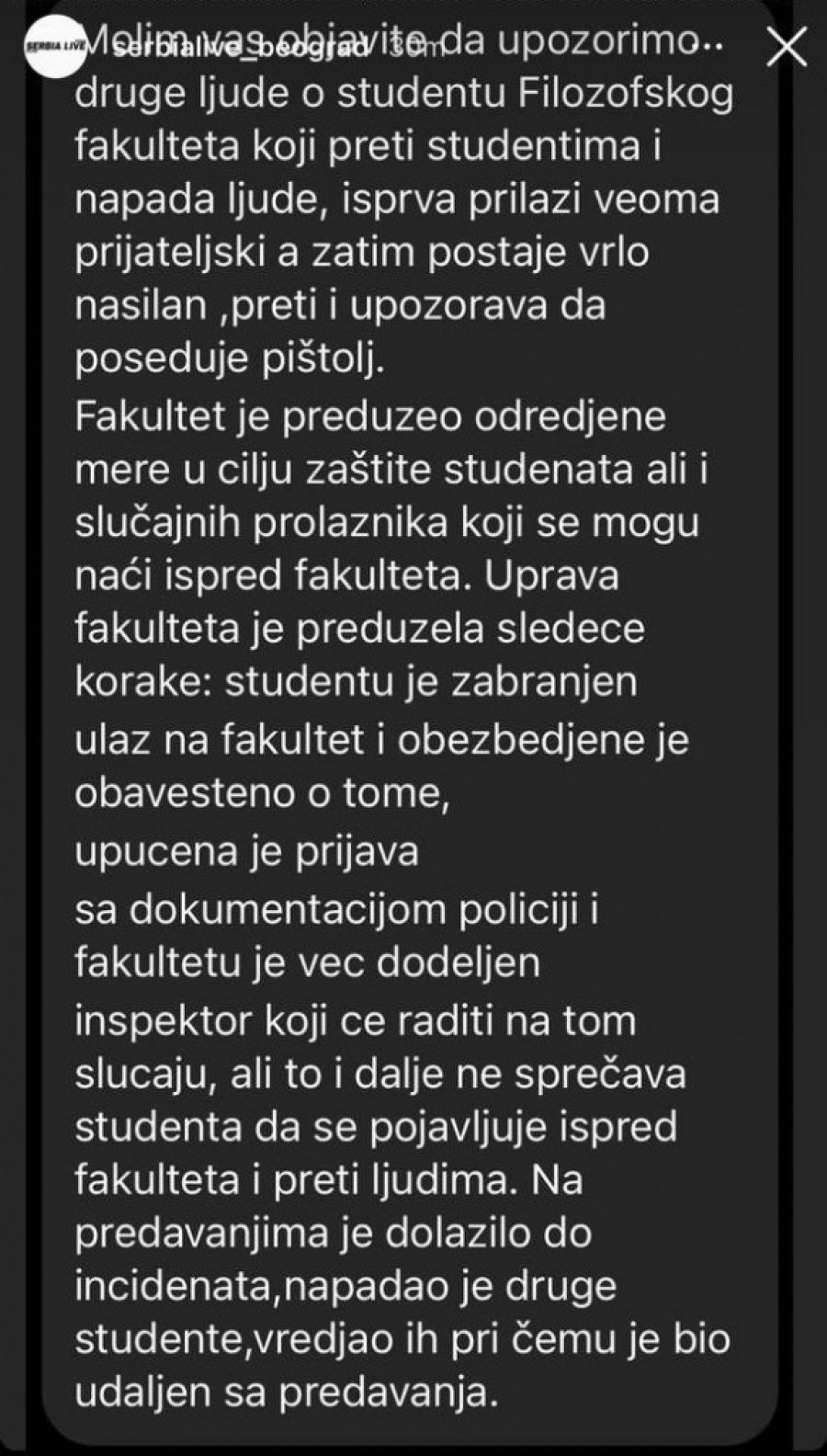 - Molim vas objavite da upozorimo druge ljude o studentu Filozofskog fakulteta koji preti studentima i napada ljude, isprva prilazi veoma prijateljski, a zatim postaje vrlo nasilan, preti i upozorava da poseduje pištolj. Fakultet je preuzeo oderđene mere u cilju zaštite studenata, ali i slučajnih prolaznika koji se mogu naći ispred fakulteta. Uprava fakulteta je preuzela sledeće korake: Studentu je zabranjen ulaz na fakultet i obezbeđenje je obavešteno o tome, upućena je prijava sa dokumentacijom policiji i fakultetu je već dodeljen inspektor koji će raditi na tom slučaju, ali to i dalje ne sprečava studenta da se pojavljuje ispred fakulteta i preti ljudima. Na predavanjima je dolazilo do incidenata, napadao je druge studente, vređao ih pri čemu je bio udaljen sa predavanja - glasi poruka upućena stranici.