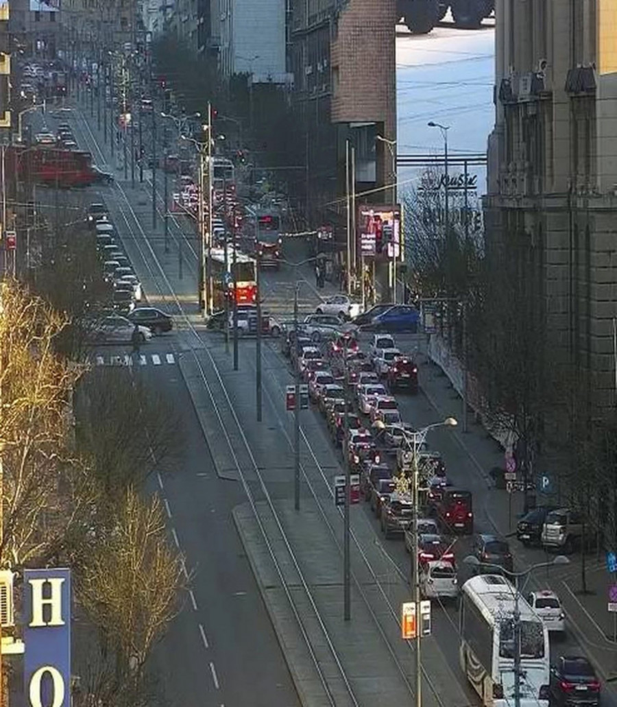 Kolona vozila u ovom trenutku kreće Brankovim mostom, iz pravca Novog Beograda ka centru, a gužve počinju u Bulevaru Mijajla Pupina, nešto pre TC "Ušće". Dalje se nastavljaju preko mosta i Brankovom ulicom.