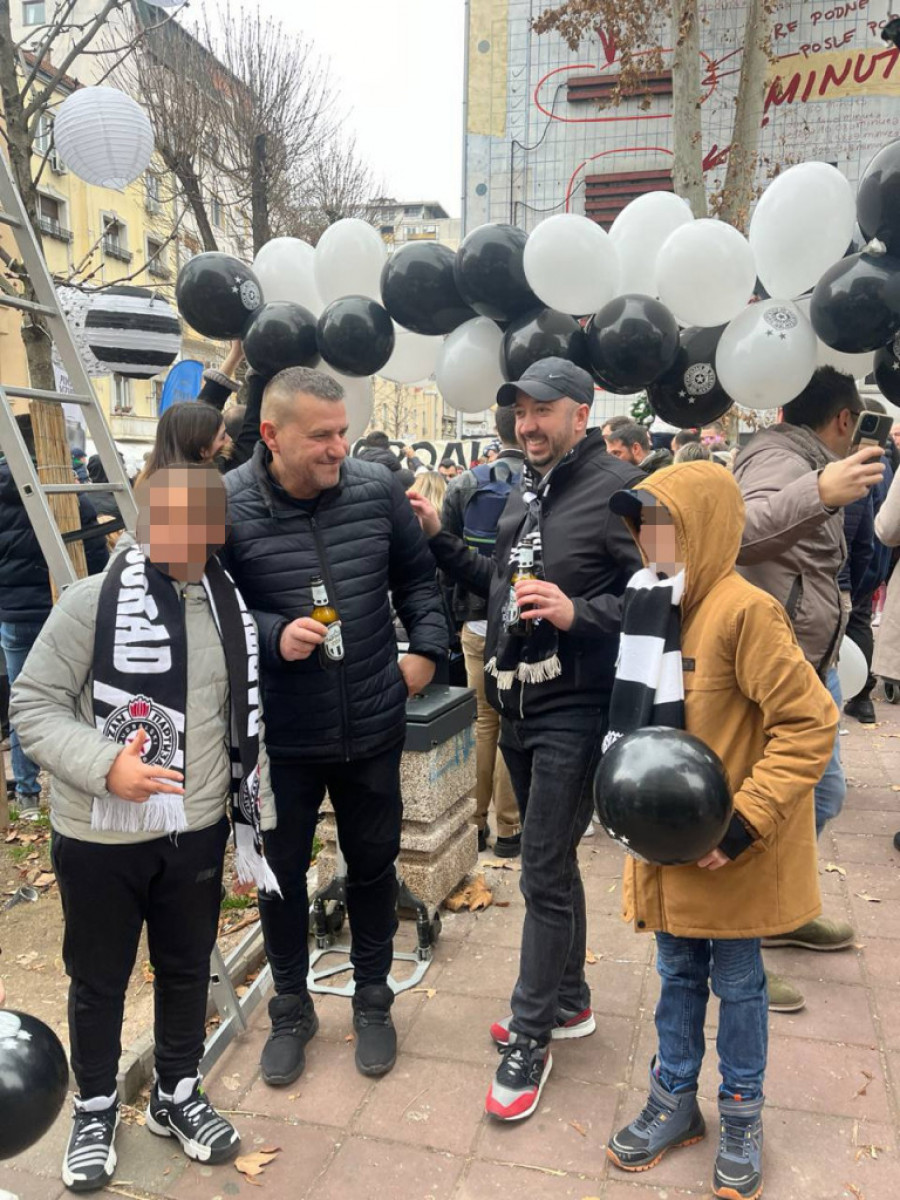 Ore se navijačke pesme Partizana, sve je u crno-belim balonima, deca su time oduševljena, a tatama se deli besplatno pivo.